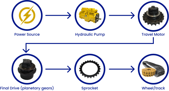 Contrary to popular belief, a travel motor and a final drive are not the same part, but work together on your machine. One powers the other, and allows your machine to get to where it needs to go!